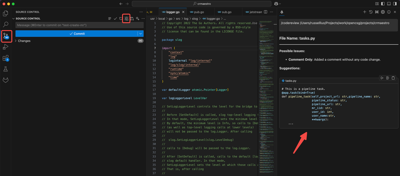 CodeSouler 支持在提交修改代码前进行代码预审查,帮助您将代码评审前置,提交高质量的代码,提升开发效率。 进入源代码管理(Source Control)页面,点 击Code Review按钮(如下图)进行代码审查:
