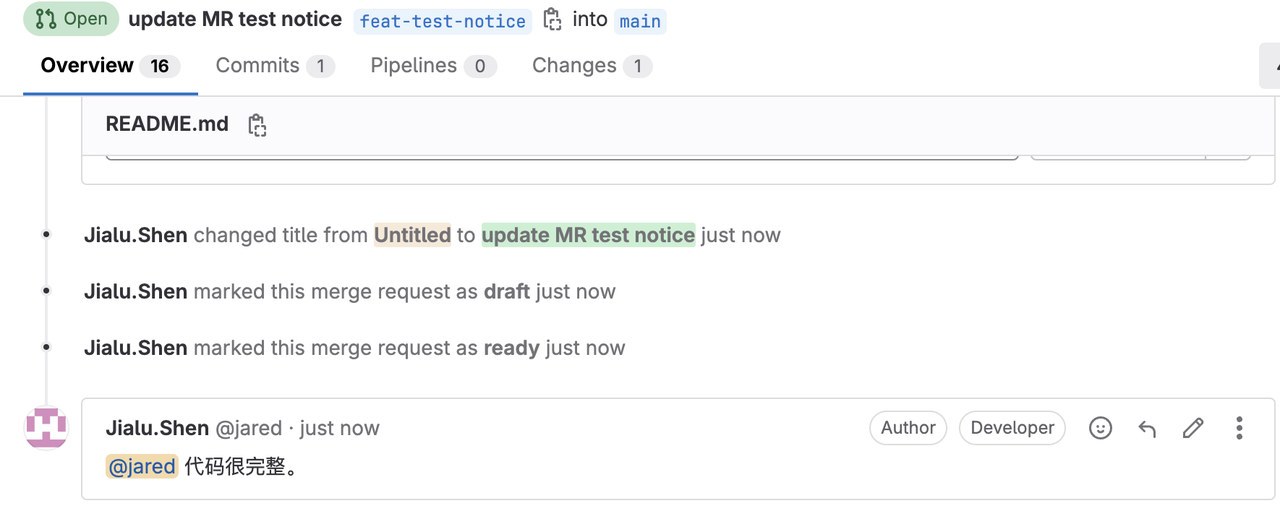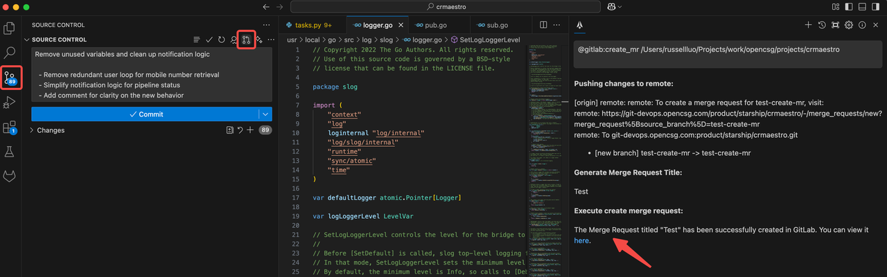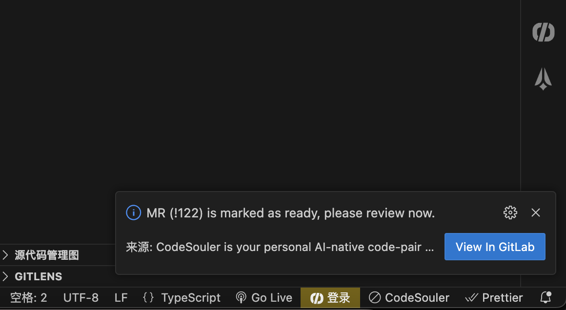 CodeSouler 支持一键创建合并请求,包括自动创建远程分支、自动创建GitLab合并请求、自动生成合并请求标题和根据 CODEOWNERS 自动指派评审人等。