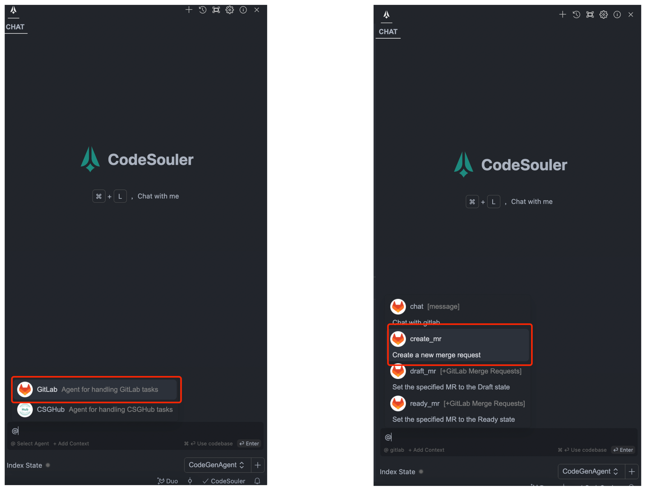 在 CodeSouler Chat 框,输入 @GitLab create_mr