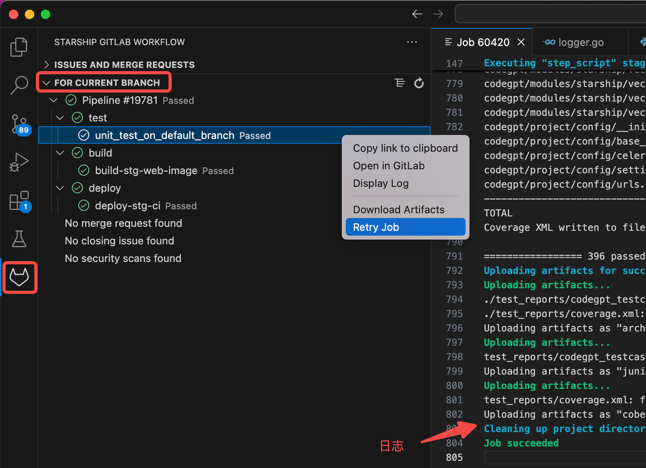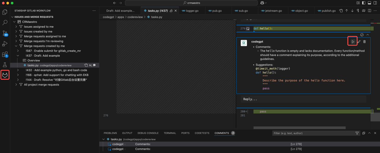 CodeSouler-GitLab助手Workflow插件本页总览Workflow插件 管理合并请求 CodeSouler 支持在IDE中管理当前项目下的合并请求,包括筛选合并请求、查看合并请求详情,以及查看和回复评论等。 应用评审建议代码 CodeSouler 支持根据评审中给出的建议代码,自动修改对应文件,完成评审建议变更。 管理流水线 CodeSouler 支持在IDE中管理当前分支对应的流水线,包括查看流水线状态、查看任务日志和执行/取消/重试流水线任务等。