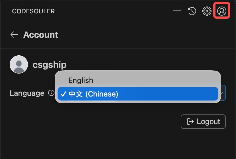 - CodeSouler 支持切换文本/注释的语言,点击 "Account" 按钮,在 Account 页面中切换。